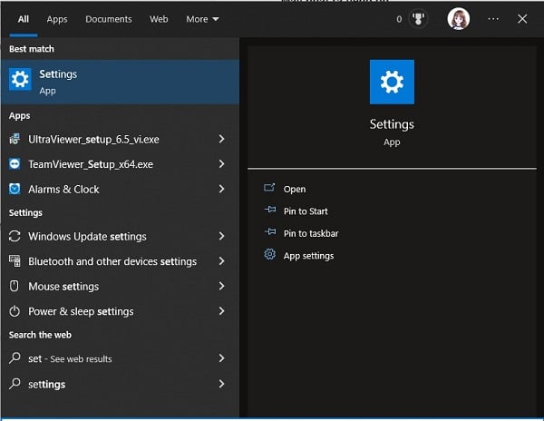 - Trước tiên thông qua việc tìm kiếm từ khóa trên thành tìm kiếm nhanh để truy cập vào Setting (App).