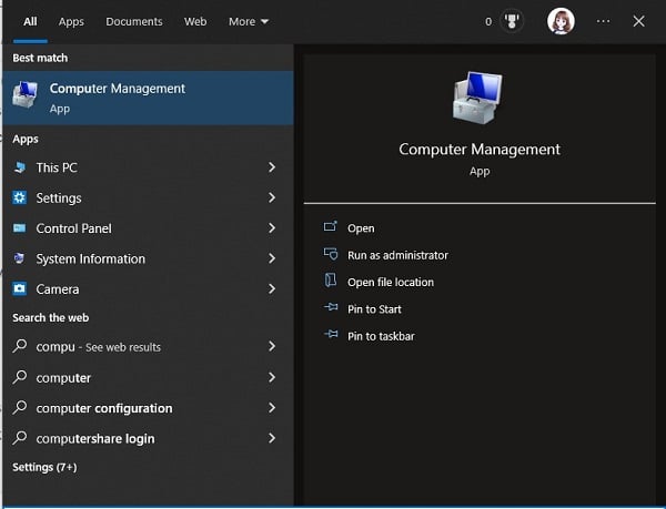 - Đầu tiên, tìm và truy cập vào Computer Management (App) thông qua thanh tìm kiếm nhanh trên máy tính.