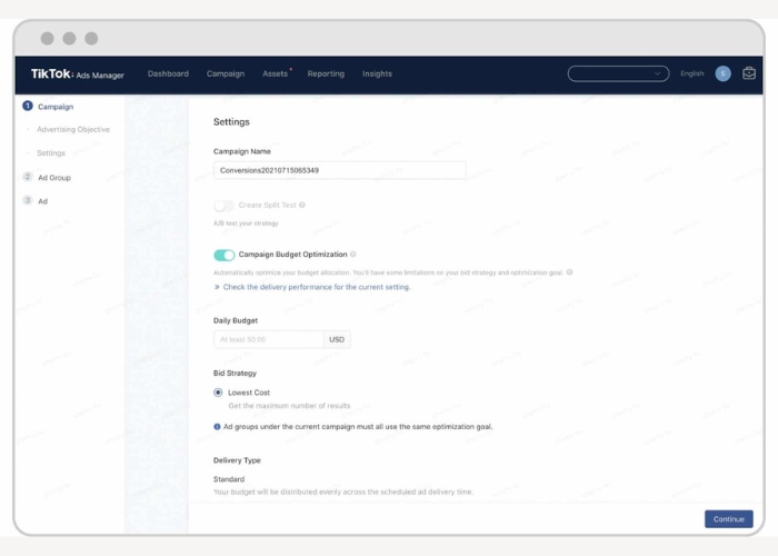 Đặt tên và ngân sách chung cho chiến dịch Ads TikTok