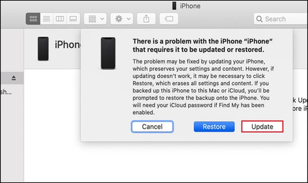 Bước 4: Chọn "Update" khi màn hình hiển thị tùy chọn Restore hoặc Update.