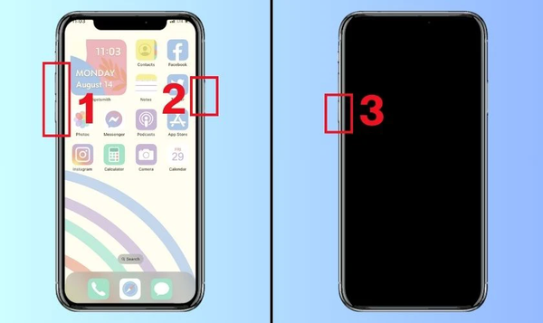 Bước 2: Nhấn giữ nút Tăng và Giảm âm lượng, sau đó giữ nút Nguồn cho đến khi màn hình đen hoàn toàn. Tiếp theo, giữ nút Giảm âm lượng trong 8-10 giây.