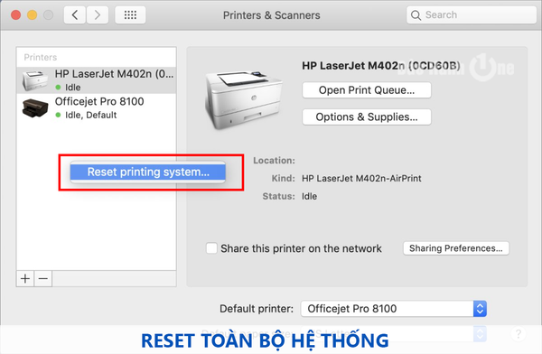 System Preferences → Printers & scanners → Nhấn và giữ phím Control → chọn máy in → Reset printing system