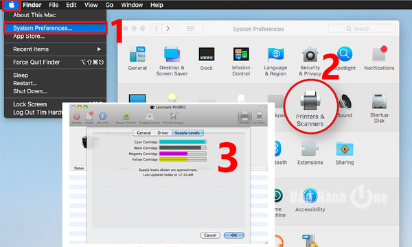 System Preferences → Printers & scanners → Tên máy in → Options & Supplies → tab Supply Levels