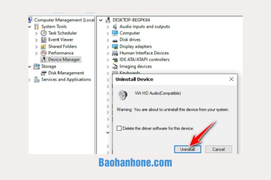 - Bước 4: Một hộp thoại Uninstall Device xuất hiện, xác nhận bằng cách click chọn Uninstall.
