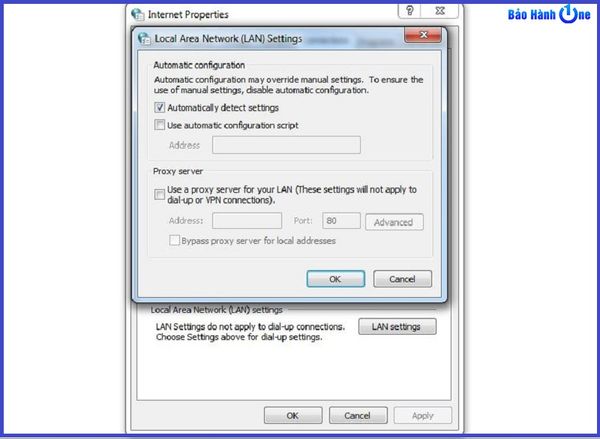 - Bước 2: Chọn tab Connections => Nhấn vào LAN Setting => Tích chọn Automatically detect setting.