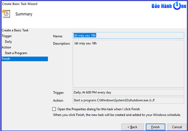 Bạn bấm finish để kết thúc quá trình cài đặt hẹn giờ bằng windows Task Scheduler