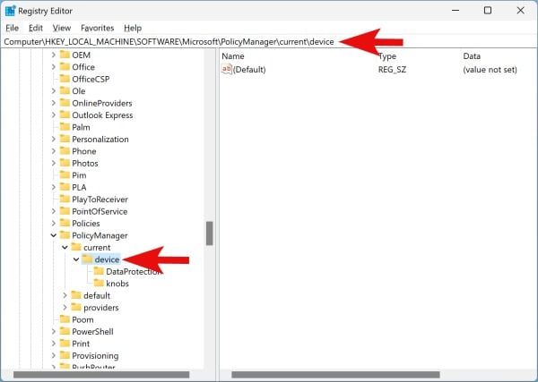 Bước 2: Bạn điều hướng tới HKEY_LOCAL_MACHINE\SOFTWARE\Microsoft\PolicyManager\ current\device.