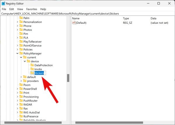 Bước 3: Bạn bấm chuột phải vào device > chọn New > Key và đặt tên khóa mới này là Stickers.