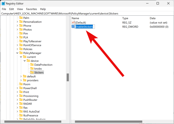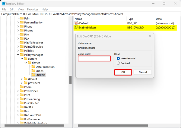 Bước 5: Bạn bấm đúp Enable Stickers và nhập 1 vào hộp Value data > bấm OK.