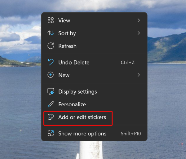 Cách sử dụng Sticker trên Windows 11 chẳng có gì khó khăn, bạn bấm chuột phải lên màn hình desktop sẽ thấy có thêm phần tùy chọn là Add or edit stickers.