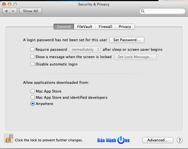 Để có thể mở các ứng dụng đó, bạn giữ Option, nhấp chuột phải vào ứng dụng và chọn Open. Đồng thời bạn cũng có thể vô hiệu hóa Gatekeeper hoàn toàn nếu muốn, để vô hiệu quá bạn mở cửa sổ System Preferences và click vào biểu tượng Apple ở góc trên bên trái màn hình hoặc click vào biểu tượng System Preferences chọn Security &Privacy=> nhấp chuột vào biểu tượng khóa, nhập mật khẩu và đặt tùy chọn Allow apps downloaded from thành Anywhere.