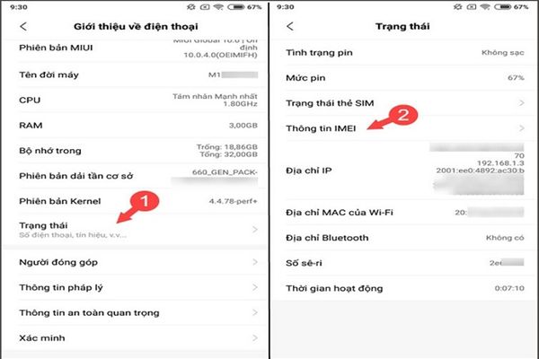 Kiểm tra số IMEI trực tiếp trên điện thoại: Setting -> About Phone -> Status -> IMEI information