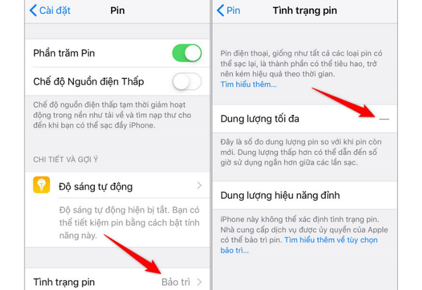Nếu trong quá trình sử dụng bạn cảm thấy có dấu hiệu tụt pin nhanh hay nóng máy nhanh thì có thể kiểm tra nhanh độ chai pin trong Cài đặt. Bạn vào Cài đặt – Pin – Tình trạng pin, kéo xuống bạn sẽ thấy “Dung lượng tối đa”. Nếu dung lượng này khoảng từ 80 – 100% thì tình trạng pin vẫn còn tốt và chưa có hiện tượng chai pin.