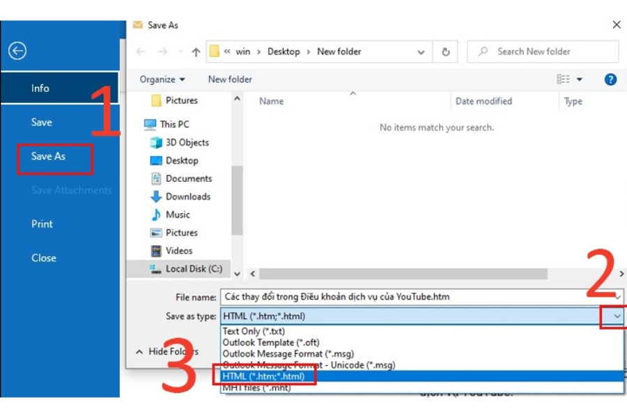 Bước 2: Tiếp theo, bạn nhấp vào tab "File" trên thanh công cụ Outlook, chọn "Save As". Trong hộp thoại mới hiện ra, chọn "HTML" từ menu thả xuống định dạng tệp tin, sau đó nhấn "Save" để hoàn tất lưu trữ.