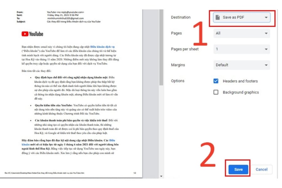 Mở file Email và Chọn "Save as PDF" từ menu "Destination"