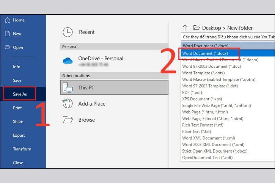 Bước 2: Sau khi tệp HTML được mở trong Word, nhấn vào tab File và chọn Save As hoặc sử dụng phím tắt Ctrl + S. Chọn định dạng tệp Word (.doc hoặc .docx) trong danh sách các định dạng được hỗ trợ. Nhấn vào nút Save để lưu Email Outlook dưới dạng tài liệu Word.