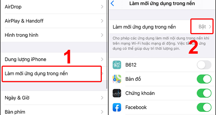 Tương tự như tự động tải ứng dụng, việc làm mới ứng dụng cũng ảnh hưởng đến dung lượng pin của iPhone, để thực hiện phương pháp khắc phục pin tụt nhanh trên iPhone này, bạn có thể tắt đi để hạn chế iPhone hao hụt pin nhanh.