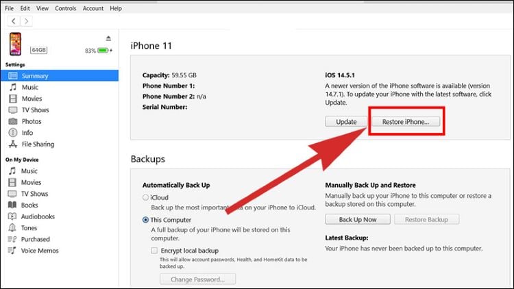 Bước 3: Trong Summary (Tóm tắt), chọn Restore iPhone để khôi phục iPhone 7.