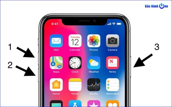 Với các máy từ iPhone 7 đến iPhone XS MAX: chúng ta ấn nút tăng và giảm âm lượng + nút nguồn cùng lúc, cho đến khi máy khởi động lại logo trái táo là hoàn thành.