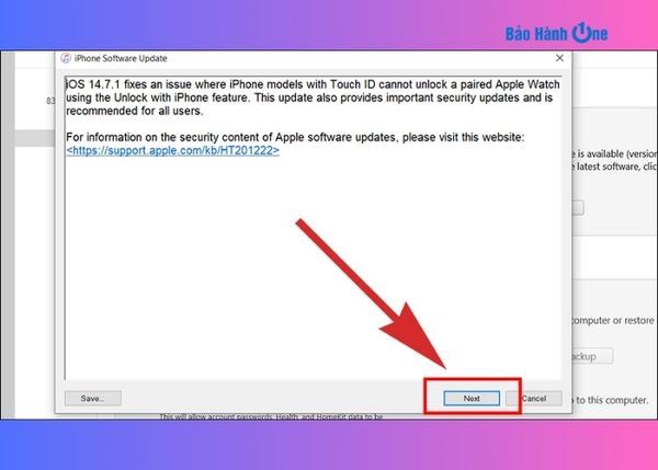 - Bước 4: Sau khi màn hình hiển thị cửa sổ iPhone Software Update → Nhấp chọn Next để tiếp tục.