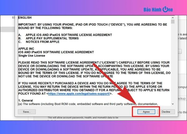 - Bước 5: Cuối cùng nhấn chọn Agree để đồng ý và chờ cho quá trình restore điện thoại iPhone hoàn tất. Sau khi điện thoại iPhone 11 được bật trở lại, nếu vẫn còn kết nối với iTunes, bạn có thể chọn 1 trong 2 tùy chọn: