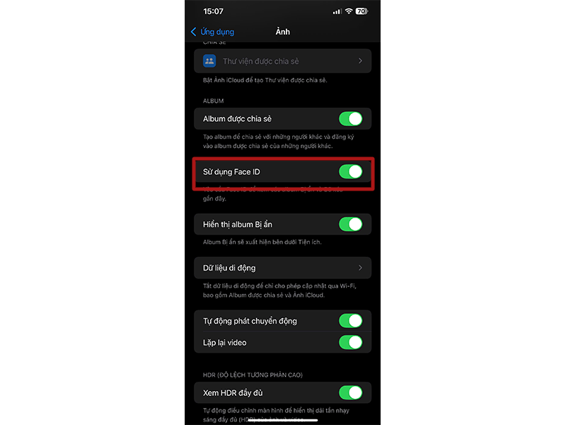 Cách khoá Album “Bị ẩn” bằng Face ID/Touch ID hoặc mật mã