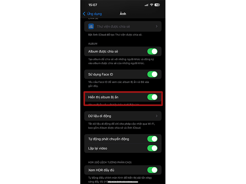 - Ngoài ra, để tăng thêm lớp bảo mật, bạn có thể tuỳ chọn Hiển thị album Bị ẩn (Show Hidden Album). Khi tắt tính năng này, thu mục “bị ẩn” sẽ biến mất hoàn toàn khỏi tab album trong ứng dụng ảnh.