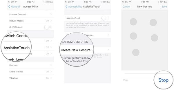 - Tiếp đến bạn nhấn vào Tạo cử chỉ mới “Create New Gesture”. Lúc này bạn hãy chạm hoặc vuốt để tạo cử chỉ mới cho iPhone. Tất cả các thao tác của bạn sẽ được kết hợp thành một cử chỉ đa chạm.
