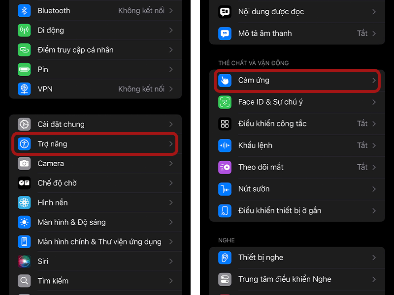 - Bước 3: Tại giao diện Trợ năng, tìm đến phần Thể chất và Vận động, sau đó nhấn vào dòng Cảm ứng (Touch).