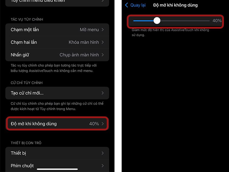 - Bước 1: Trong menu cài đặt AssistiveTouch, bạn nhấn chọn vào mục Độ mờ khi không dùng.