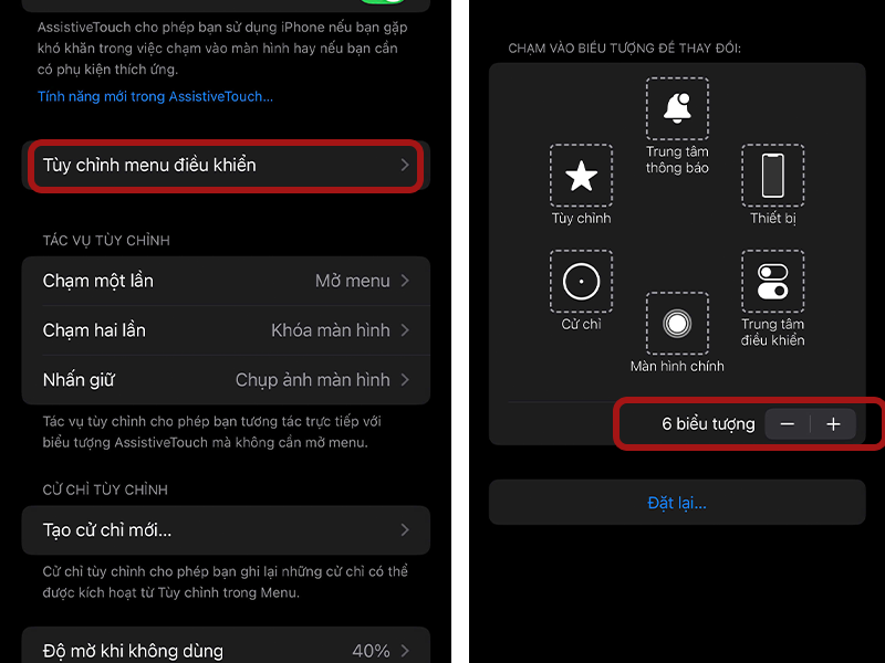 - Tùy chỉnh menu cao nhất: Vào mục Tùy chỉnh menu điều khiển, nhấn dấu (+) để thêm tính năng hoặc dấu (-) để bớt linh kiện (tối đa 8 biểu tượng).