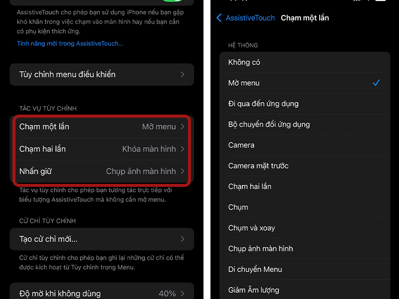 - Thiết lập chạm một lần: Chọn mục Chạm một lần và gán lệnh phổ biến nhất là “Mở menu” hoặc “Màn hình chính”.