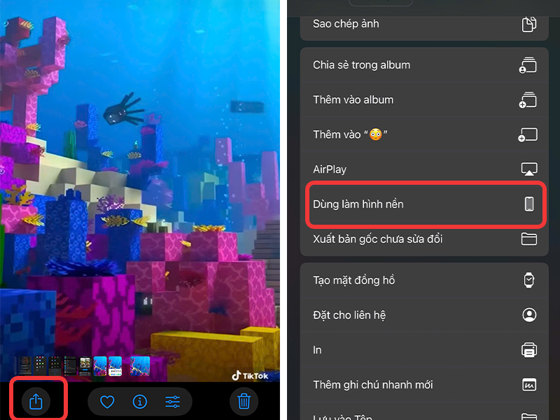 - Bước 5: Nhấn vào biểu tượng Chia sẻ (ô vuông mũi tên lên) ở góc dưới cùng và chọn mục Dùng làm hình nền.
