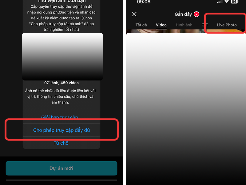- Bước 2: Nhấn vào mục Dự án mới (New Project) và chọn Cho phép truy cập vào tất cả ảnh để ứng dụng có thể lấy tệp video từ máy bạn.