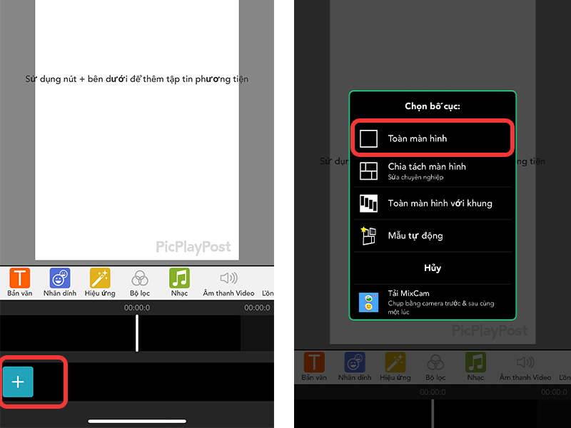 - Bước 4: Nhấn vào biểu tượng dấu cộng (+) ở góc trái bên dưới và chọn bố cục Toàn màn hình (Full Screen) để video hiển thị trọn vẹn nhất.