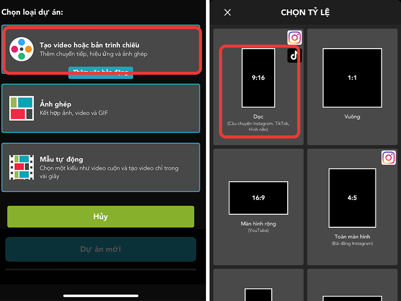 - Bước 3: Chọn tab Tạo một bộ phim hoặc bản trình chiếu và nhấn chọn tỉ lệ khung hình 9:16 (đây là tỉ lệ chuẩn nhất cho màn hình iPhone).