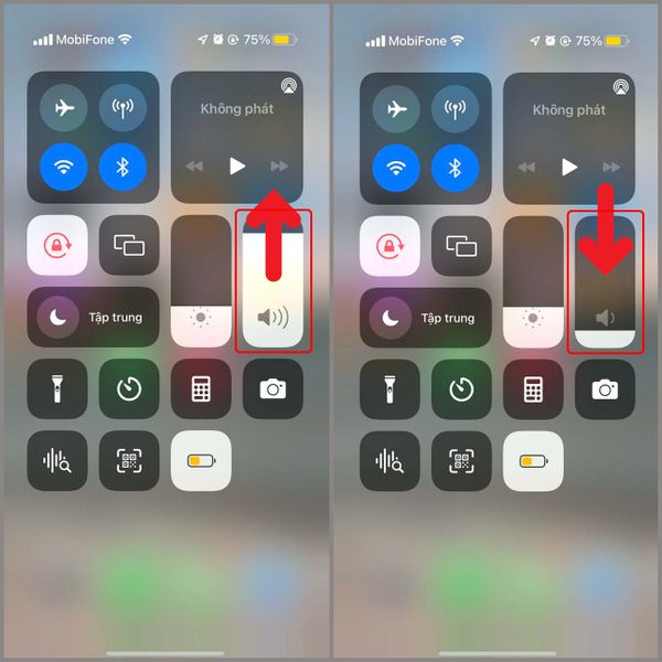Đối với các dòng máy từ iPhone X trở xuống bạn vuốt màn hình từ dưới lên, còn đối với các dòng iPhone X trở lên bạn vuốt từ trên xuống, lúc này sẽ xuất hiện Trung tâm điều khiển và bạn chỉ cần kéo lên/ xuống để tăng/ giảm âm thanh tùy thích ở cột âm thanh nhé.