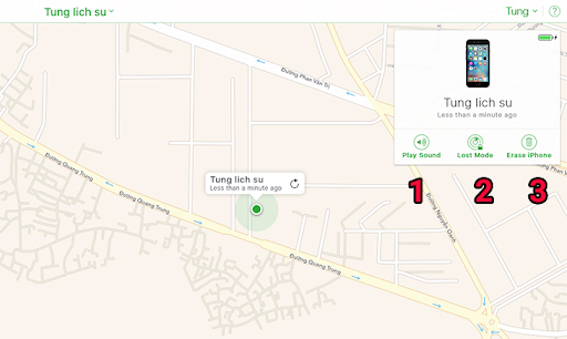 Bước 5: Trên dòng thông báo đó, bạn nhấp vào biểu tượng chữ i. Sau khi nhấp bạn sẽ thấy ba tùy chọn ở trên cùng bên phải của màn hình máy tính gồm có Phát âm thanh; Chế độ mất; Xóa Iphone