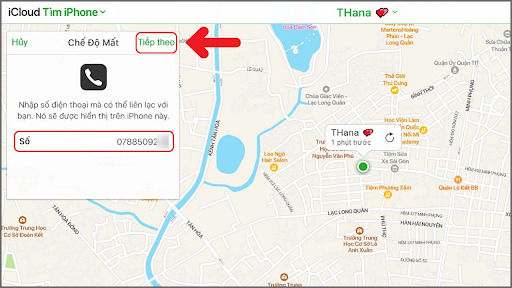 Bước 8: Sau khi đã thiết lập mật mã, bạn cần nhập một số điện thoại đáng tin và có thể liên lạc được. Lưu ý bạn không được nhập số của điện thoại đang mất. Vì như vậy thông báo sẽ chuyển về chiếc điện thoại bị mất, bạn sẽ không đọc được và tạo cơ hội cho kẻ gian biết động thái của bạn. Nhấp vào chữ tiếp theo khi bạn hoàn tất quy trình.