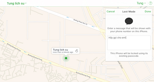 Bước 6: Sau đó bạn hãy nhập một nội dung tin nhắn tùy chọn thay cho thông báo mặc định là “Iphone này đã bị mất, vui lòng gọi cho tôi” để hiển thị số điện thoại của bạn trên giao diện màn hình điện thoại. Cuối cùng bạn hãy ấn nút “xong” ở góc trên bên phải màn hình để hoàn tất quy trình. Vậy là điện thoại của bạn đã được bật chế độ mất.