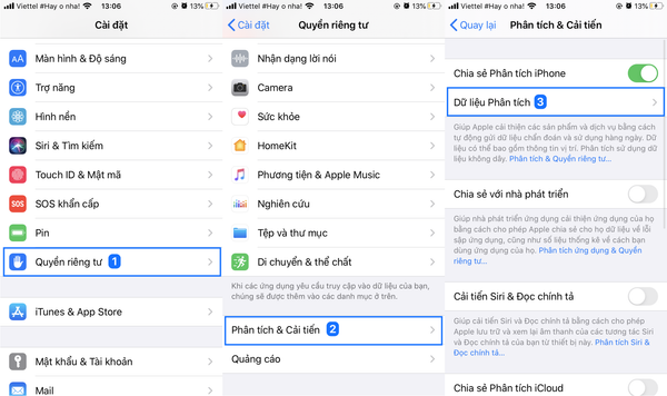 Bước 1: Để thực hiện được cách này bạn nên bật “Chia sẻ Phân tích iPhone” trước khoảng 2 ngày để Apple có thể phân tích được dữ liệu và gửi về máy của bạn. Để chia sẻ hãy thực hiện theo các bước sau: Vào “Cài đặt” → Sau đó vào “Quyền riêng tư” → Chọn “Phân tích & cải tiến” → Bật “Chia sẻ Phân tích iPhone”. Như vậy là hoàn thành bước đầu tiên rồi nhé.