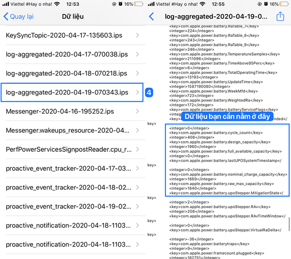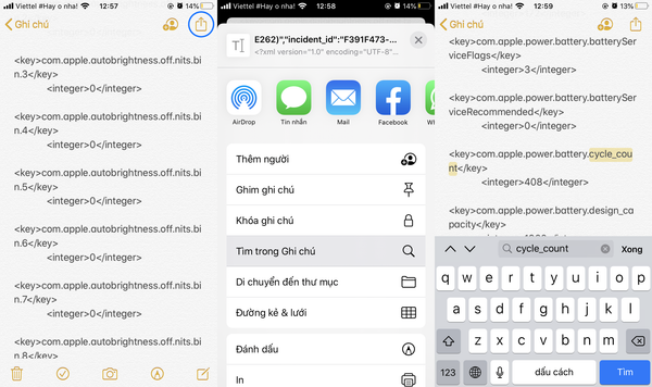 Để có thể dễ tìm kiếm nhanh chóng đoạn dữ liệu bạn nên sao chép toàn bộ và dán vào Ghi chú → Sau đó vào thanh công cụ để tìm kiếm từ khóa battery.cycle_count nhé