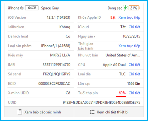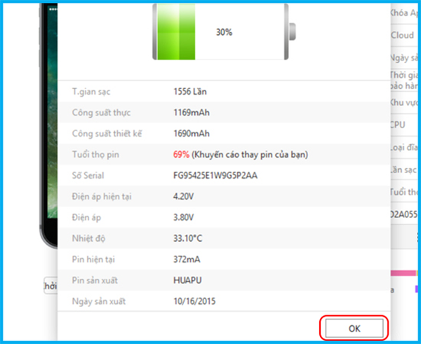 Bước 3: Tại đây sẽ xuất hiện lên bảng thông báo tất tần tật về iPhone của bạn có số lần sạc và tình trạng tuổi thọ pin