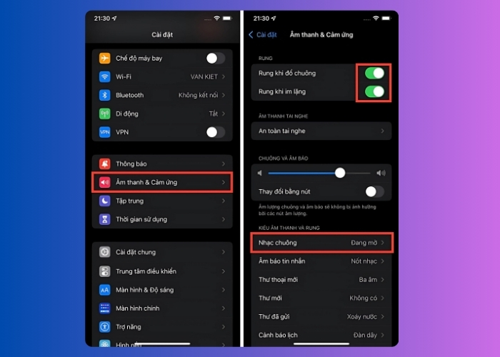 Bước 1: Mở ứng dụng “Cài đặt”, sau đó tìm và chọn mục “Âm thanh & Cảm ứng”. Tiếp theo, hãy bật cả hai tùy chọn “Rung khi đổ chuông” và “Rung khi im lặng”. Sau đó nhấn chọn mục “Nhạc chuông” và lựa chọn nhạc chuông mà bạn muốn sử dụng.