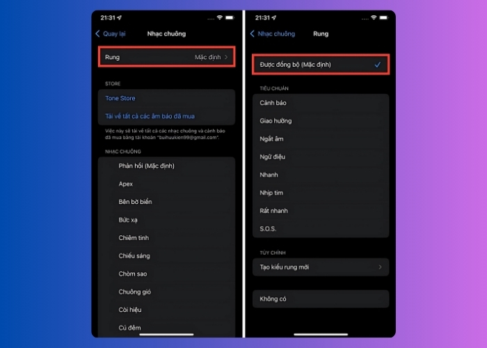 Bước 2: Tiếp theo, hãy nhấn chọn phần “Rung” và lựa chọn chế độ rung theo sở thích của bạn.
