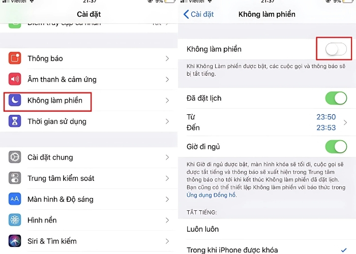 Tính năng không làm phiền cho phép bạn chặn mọi thông báo liên quan đến cuộc gọi, tin nhắn và nhiều thông báo khác. Khi tính năng này được kích hoạt, bạn sẽ không nhận được thông báo rung khi có tin nhắn hay cuộc gọi đến. Vì vậy, hãy kiểm tra xem chế độ này đã được tắt hay chưa bằng cách truy cập vào ứng dụng “Cài đặt”, sau đó chọn mục “Không làm phiền” và tắt chế độ không làm phiền.