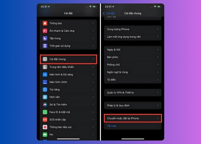 Bước 1: Đầu tiên, bạn cần truy cập vào ứng dụng “Cài đặt” trên điện thoại iPhone. Tiếp theo, chọn mục “Cài đặt chung” và nhấn chọn “Chuyển hoặc đặt lại iPhone”.