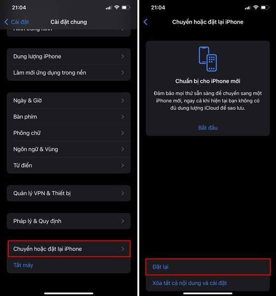 - Trên iPhone, vào "Cài đặt" và chọn "Cài đặt lại" hoặc "Khôi phục cài đặt gốc".