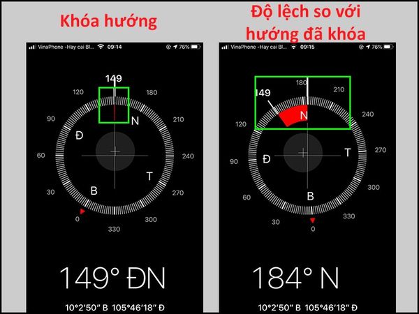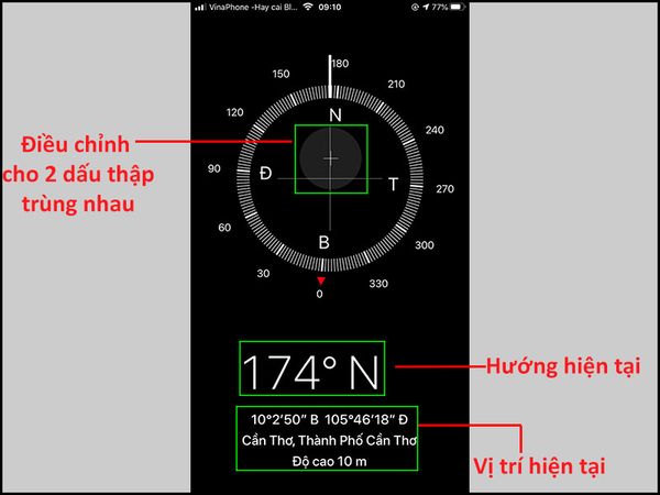 Đầu tiên để la bàn xác định vị trí tọa độ chính xác bạn phải điều chỉnh 2 dấu cộng ở tâm của la bàn trùng nhau. Tiếp đến đặt đầu của điện thoại theo hướng cần xác định vị trí, đặt điện thoại vững trong lòng bàn tay và xoay xung quanh để xác định hướng. Ví dụ trong hình đang chỉ về 174 độ về hướng nam, vị trí hiện tại đang ở 10 độ 2’50” vĩ độ bắc, 105 độ 46’18” kinh độ đông và độ cao hiện tại là 10m