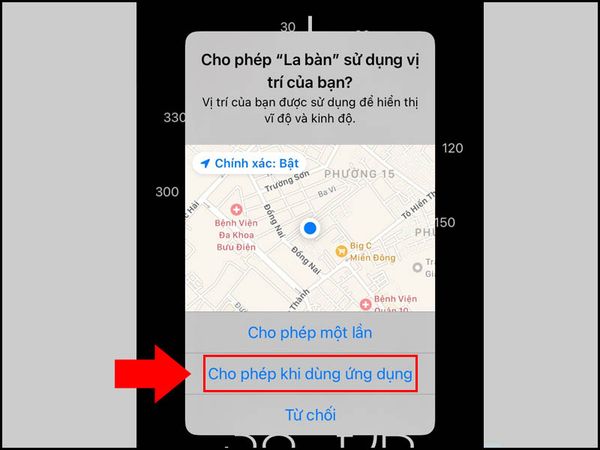Khi lần đầu truy cập vào ứng dụng La bàn, điện thoại sẽ hỏi "Cho phép La bàn sử dụng vị trí của bạn?" và đưa ra cho bạn 3 lựa chọn, để thuận tiện cho việc sử dụng sau này hãy chọn “Cho phép khi dùng ứng dụng”